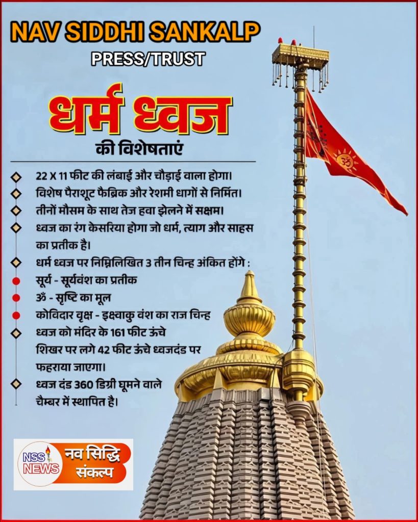 राम मंदिर के शिखर पर फराया जाने वाला ध्वज 10 फीट ऊंचा और 20 फीट लंबा, समकोण त्रिभुजाकार है। इस पर एक उज्ज्वल सूर्य की छवि है, जो भगवान श्री राम की प्रतिभा और वीरता का प्रतीक है, साथ ही कोविदारा वृक्ष की छवि के साथ इस पर ‘ओम’ अंकित है।