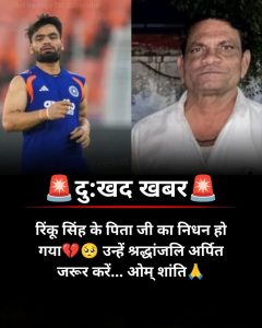 भारतीय क्रिकेटर रिंकू सिंह के पिता खानचंद सिंह का 58 वर्ष की उम्र में निधन हो गया, वो लंबे समय से स्टेज 4 लिवर कैंसर से जूझ रहे थे. 21 फरवरी से वो नोएडा के अस्पताल में वेंटिलेटर पर थे. उनको वेंटिलेटर पर रखा गया था और शुक्रवार तड़के सुबह वो कैंसर से जंग हार गए।